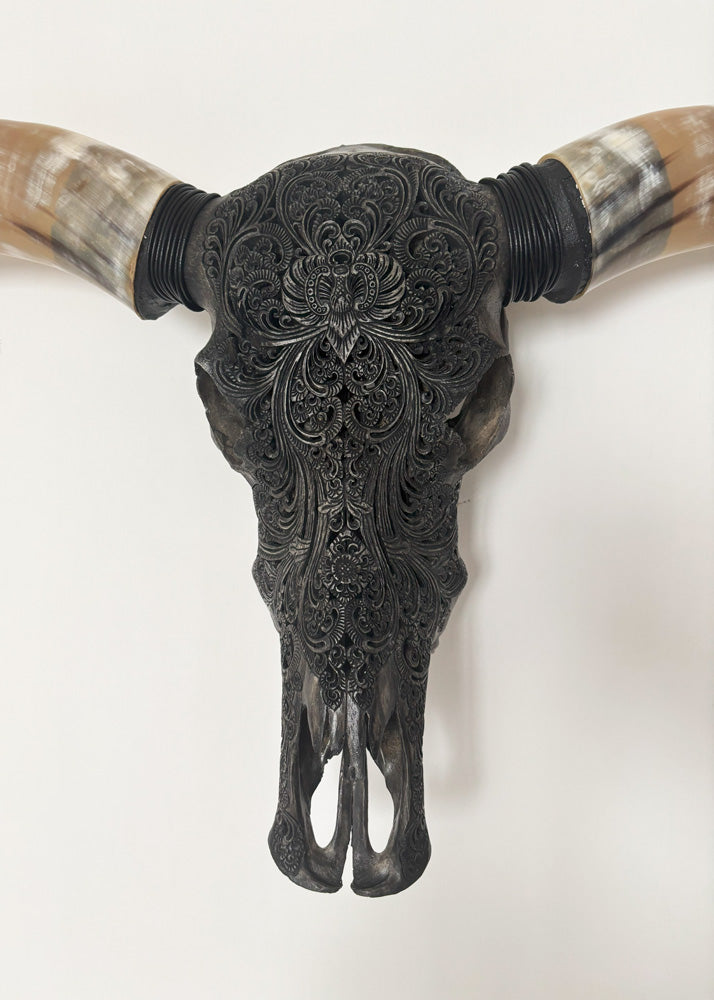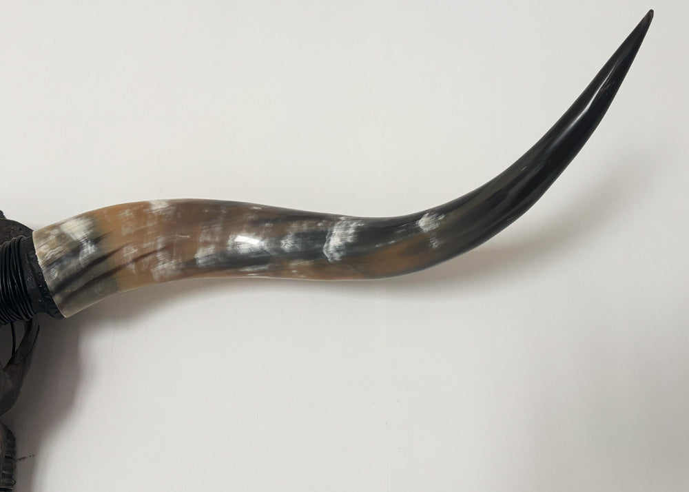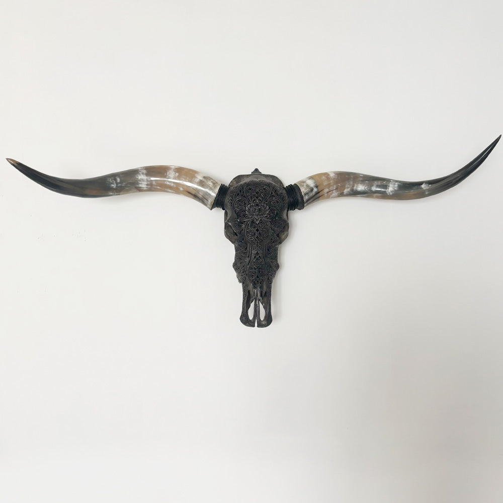 The authentic longhorn hand-carved skull is a stunning and rare item that will surely add a touch of unique beauty to any wall collection. The skull is ethically sourced and hand-carved ,making each piece one-of-a-kind. This exquisite work of art is a true testament to the skill and craftsmanship of the artist who created it. Don't miss out on the opportunity to own such a remarkable piece.