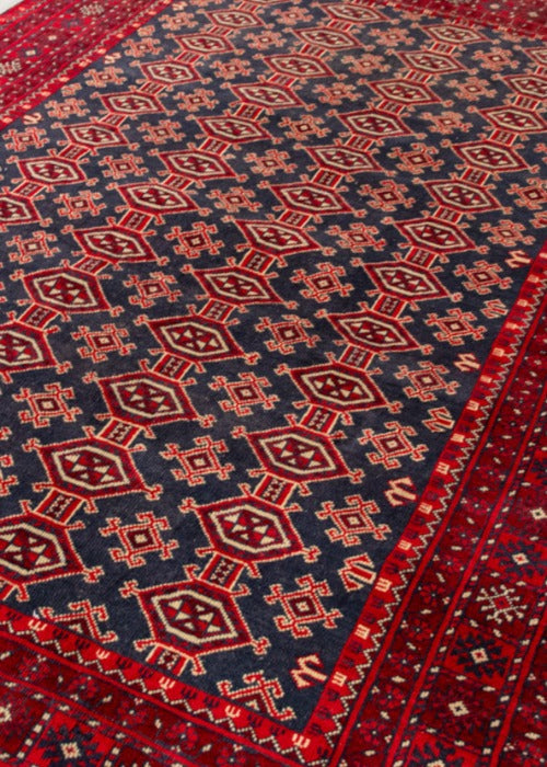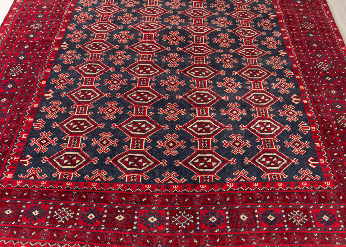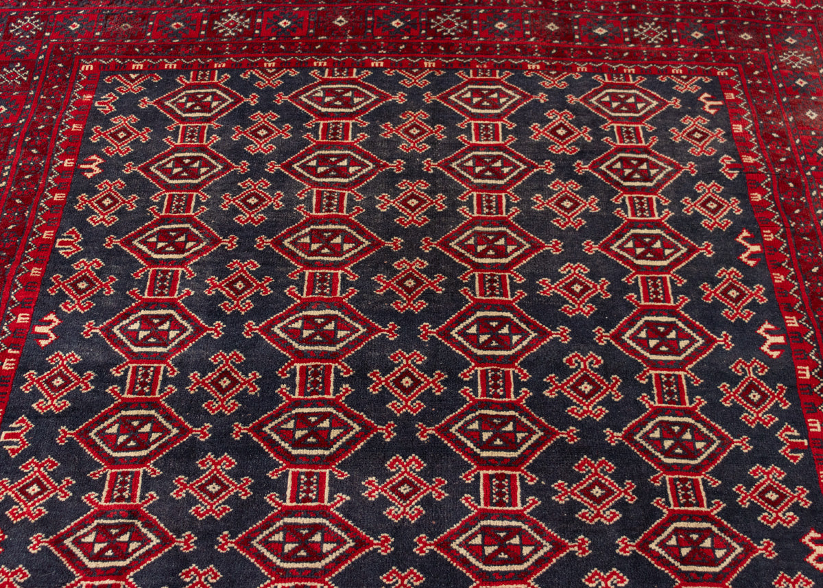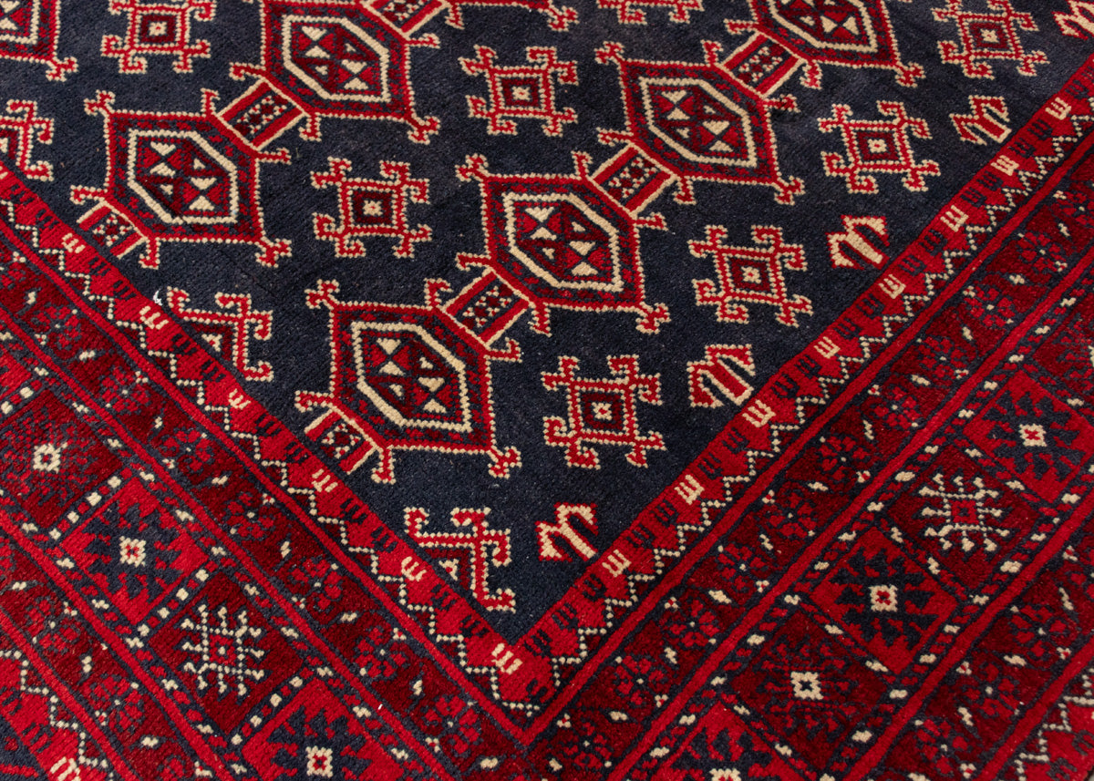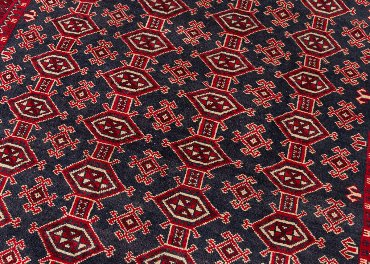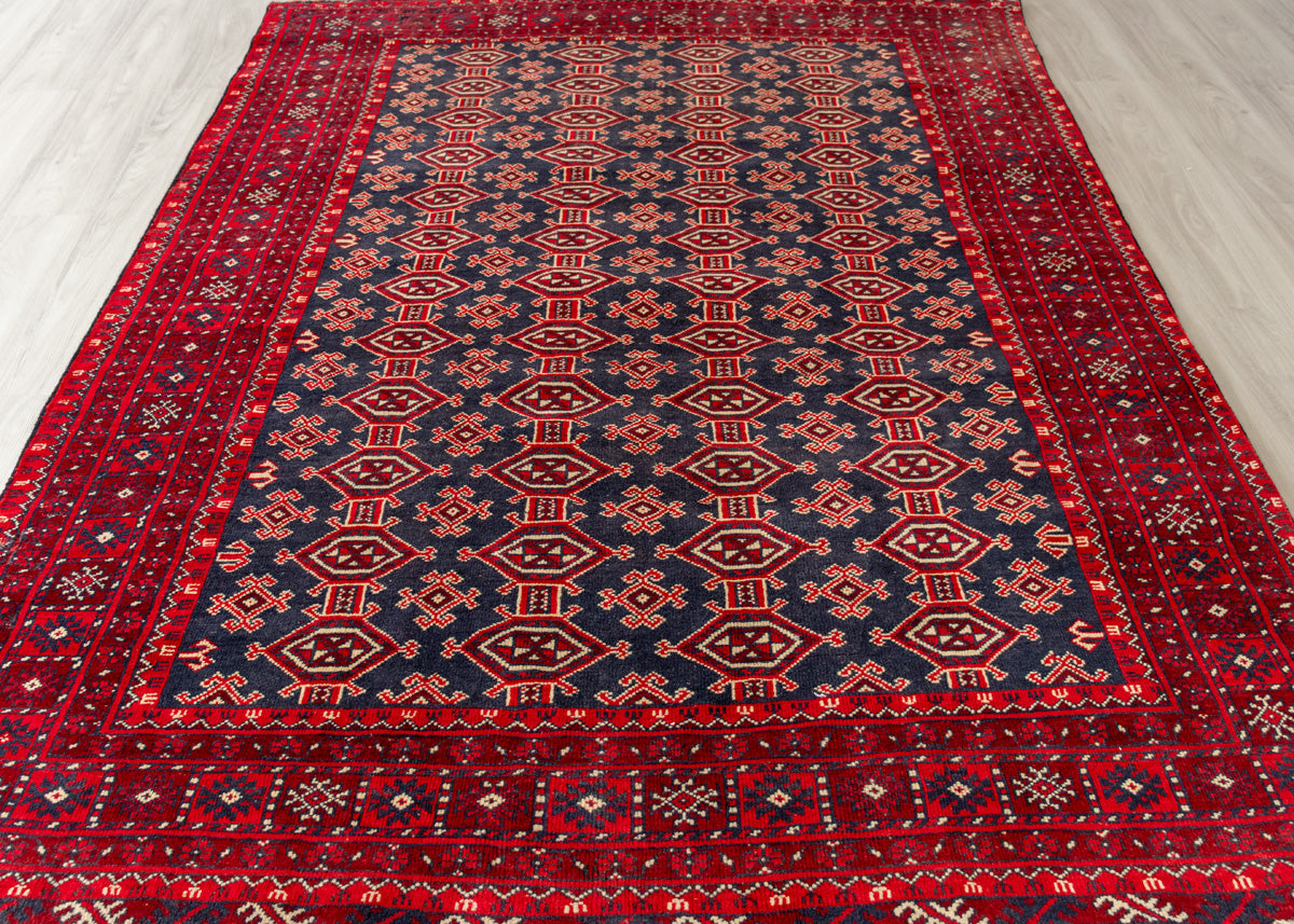 This is a lovely piece made with a nomadic Saravani pattern with a rich colour combination. Baluch rugs are from nomadic Baluchi tribes in the eastern part of Iran. Baluchi carpets normally come in small sizes. The designs usually can find in the geometric patterns, trees, and leaf which normally describe their tribal life. The colours of Baluch rugs are usually rich burgundy with some dark navy blue or black.