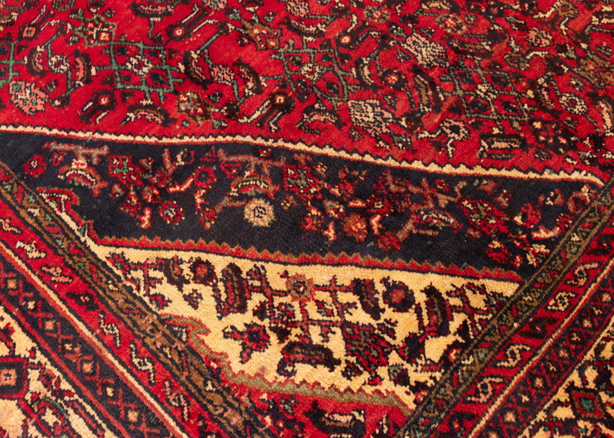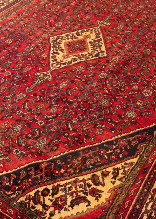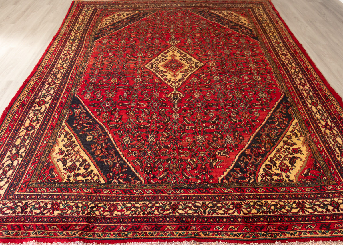 Super unique piece from Hosein-Abad village with loazy pattern. Hamadan rugs are originated from the ancient city of Hamadan in western Iran. These rugs are knotted in symmetrical patterns with a cotton foundation with the wool pile. There are two most famous fine carpets designed in, Hosseinabad or Nahawand.