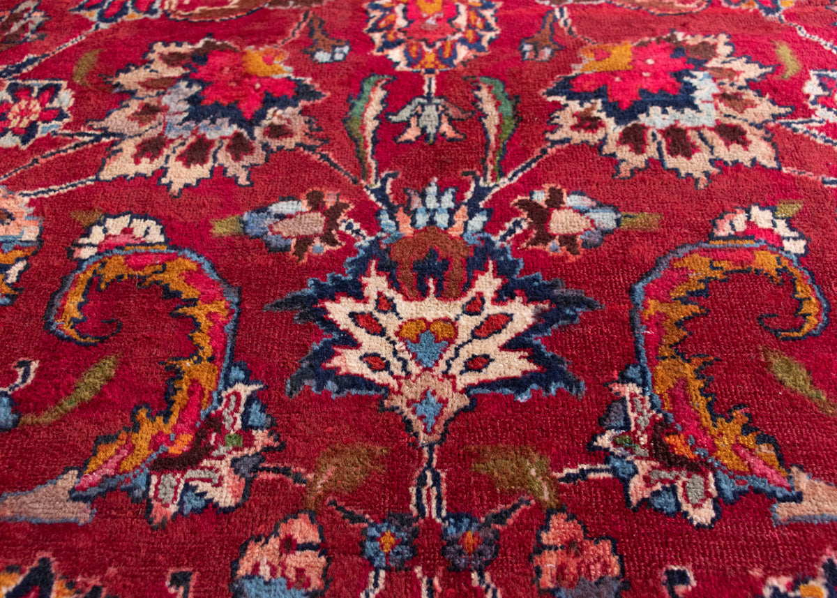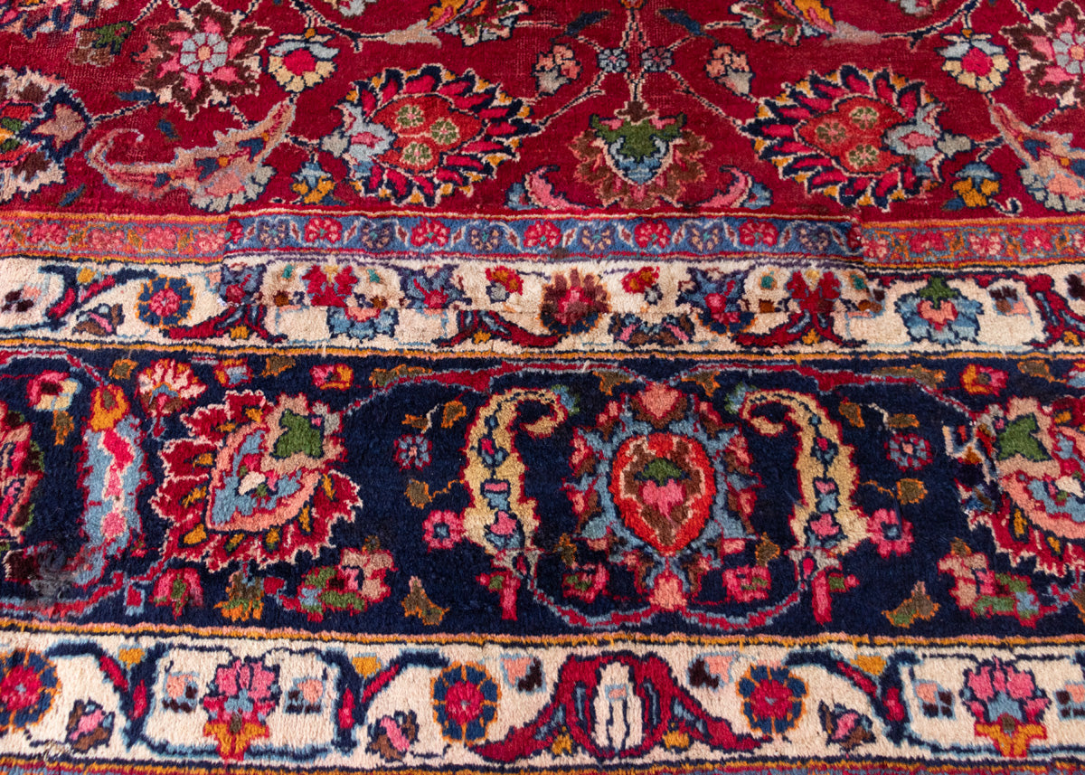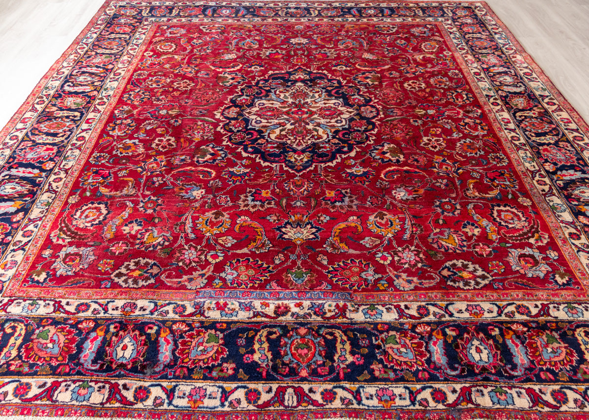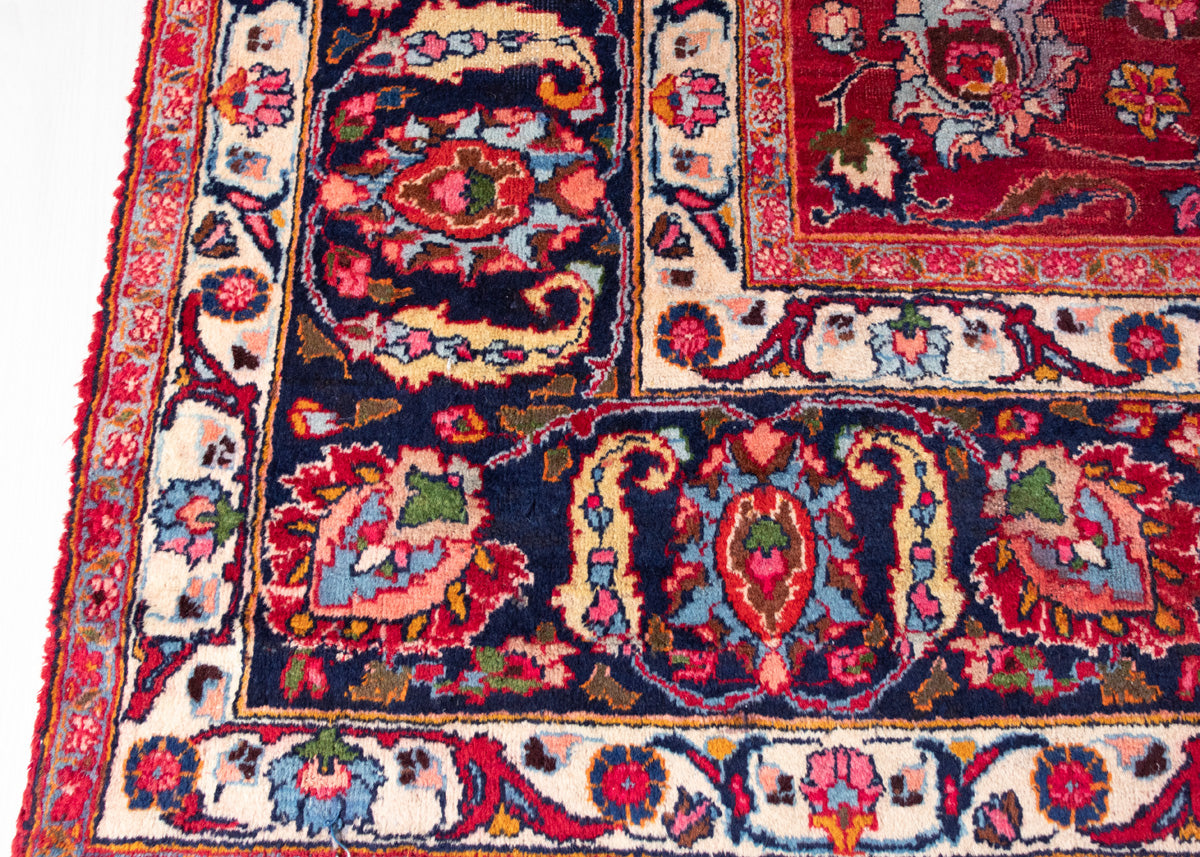 Mashad rugs are originated from Mashhad city which is located Khorasan province of northeastern Iran. Mashhad is the ancient city of Khorasan, and it was the capital of Khorasan province. It is a holy place and destination for pilgrims. Mashad hand-knotted rugs in the sixteenth to eighteenth have floral designs with beautiful colour combinations. Mashad carpets colouration background generally in red-blue or pomegranate-red. Normally in the designs used palmettes, flowers, leaves, vines, stylized motifs, and minor borders.
